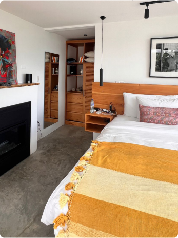 Extra pillows Clothes hangers Towels Private shower and toilet Hair dryer Bathrobes Fireplace Ceiling fan Floor fan Closet (drawers and hangers) Coffee station Portable clothes iron Luggage rack Security box Yoga mats Charging docks Starlink router Private patio Private planter
